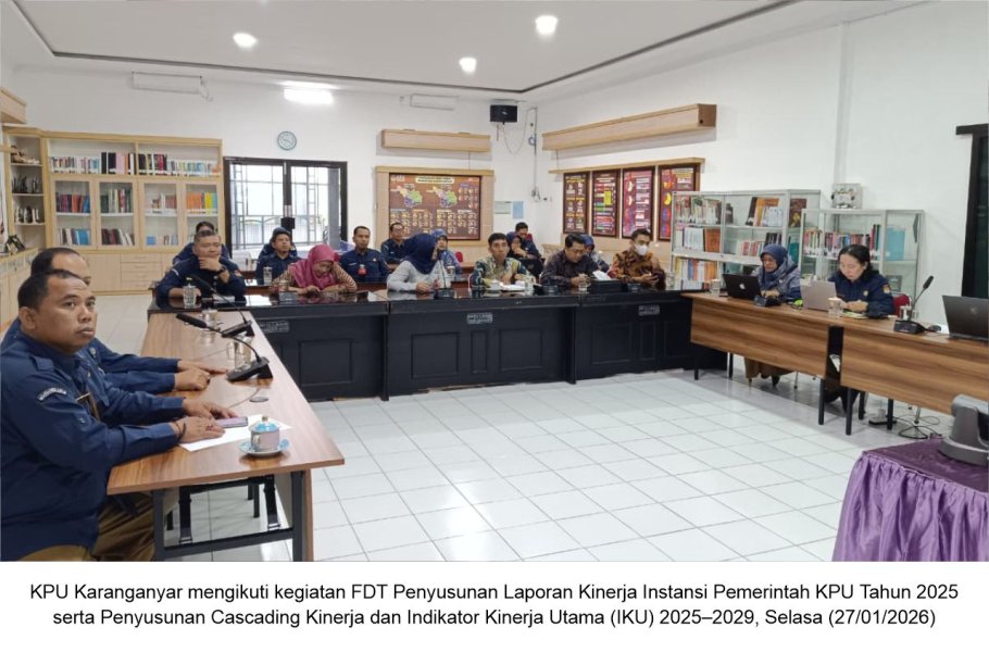 KARANGANYAR – Komisi Pemilihan Umum (KPU) Kabupaten Karanganyar mengikuti kegiatan Forum Diskusi Terpumpun (FDT) Penyusunan Laporan Kinerja Instansi Pemerintah (LKjIP) KPU Tahun 2025 serta Penyusunan Cascading Kinerja dan Indikator Kinerja Utama (IKU) KPU, KPU Provinsi, dan KPU Kabupaten/Kota Tahun 2025–2029. Kegiatan ini dilaksanakan secara hybrid oleh KPU Republik Indonesia dan diikuti secara daring melalui zoom meeting pada Selasa (27/01/2026). Forum tersebut diikuti oleh Ketua, Anggota, Pejabat Struktural, serta Pejabat Fungsional KPU Provinsi dan KPU Kabupaten/Kota se-Indonesia. Kegiatan ini menjadi bagian dari upaya berkelanjutan KPU RI dalam memperkuat Sistem Akuntabilitas Kinerja Instansi Pemerintah (SAKIP) di lingkungan KPU, mulai dari perencanaan, pengukuran kinerja, pelaporan, hingga evaluasi kinerja kelembagaan yang terintegrasi dari tingkat pusat hingga daerah. Selain itu, FDT ini juga bertujuan untuk menyelaraskan perencanaan dan pengukuran kinerja di seluruh tingkatan KPU agar sejalan dengan arah kebijakan serta sasaran strategis lembaga pada periode 2025–2029. Hadir sebagai narasumber, Fungsional Perencana Ahli Pertama Kementerian PPN/Bappenas, Hanifa Eka Rahmadiyani, yang memaparkan persiapan penyusunan Cascading Kinerja dan IKU KPU sesuai Renstra KPU Tahun 2025–2029, RPJMN 2025–2029, serta hasil Evaluasi Rencana Kerja Pemerintah (RKP) Tahun 2025. Dalam paparannya, Eka menjelaskan bahwa visi dan misi Presiden dijabarkan dalam RPJMN 2025–2029 dengan arah pembangunan yang mencakup delapan Prioritas Nasional (PN) Asta Cita. “Kontribusi KPU RI dalam struktur Prioritas Nasional pada Pemutakhiran RKP 2025 mencakup tiga PN Asta Cita yang kemudian dijabarkan menjadi Rincian Output Prioritas Nasional KPU RI,” jelasnya. Ia menambahkan, pasca pelaksanaan Pemilu 2024 dan Pilkada Serentak 2024, Prioritas Nasional KPU diarahkan untuk disempurnakan agar pelaksanaan Pemilu dan Pilkada ke depan dapat berjalan lebih optimal. Adapun tiga Rincian Output PN KPU RI tersebut meliputi Pendidikan Pemilih Pemula, Kelompok Rentan dan Marjinal; Penguatan dan Integrasi Sistem Informasi Pemilu; serta Pendataan Daftar Pemilih Tetap (DPT) Berkelanjutan. Sementara itu, narasumber dari Kementerian PANRB, Analis Kebijakan Ahli Pertama Dwi Slamet Riyadi, menyampaikan materi terkait peningkatan kualitas implementasi SAKIP, khususnya pada komponen pelaporan kinerja. Ia menjelaskan bahwa Laporan Kinerja merupakan bentuk pertanggungjawaban pelaksanaan kinerja instansi pemerintah selama satu tahun. “Setiap program dan kegiatan penyelenggara negara harus dapat dipertanggungjawabkan hasilnya melalui informasi kinerja yang terukur, disertai analisis capaian kinerja atas setiap sasaran dan indikator,” ujar Slamet. Forum ini juga diisi dengan reviu Cascading Kinerja KPU oleh narasumber Kementerian PANRB. Cascading kinerja merupakan penjabaran tujuan strategis KPU RI ke dalam sasaran, indikator, dan target kinerja hingga ke tingkat KPU Provinsi dan KPU Kabupaten/Kota. Dengan demikian, seluruh unit kerja memiliki arah yang sama dan saling mendukung pencapaian tujuan nasional KPU. (FIX) ....