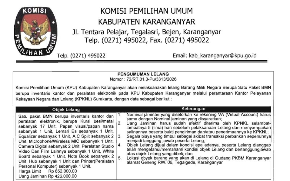 Pengumuman Lelang Barang Milik Negara (BMN) yaitu Inventaris Kantor dan Peralatan Elektronik pada KPU Karanganyar