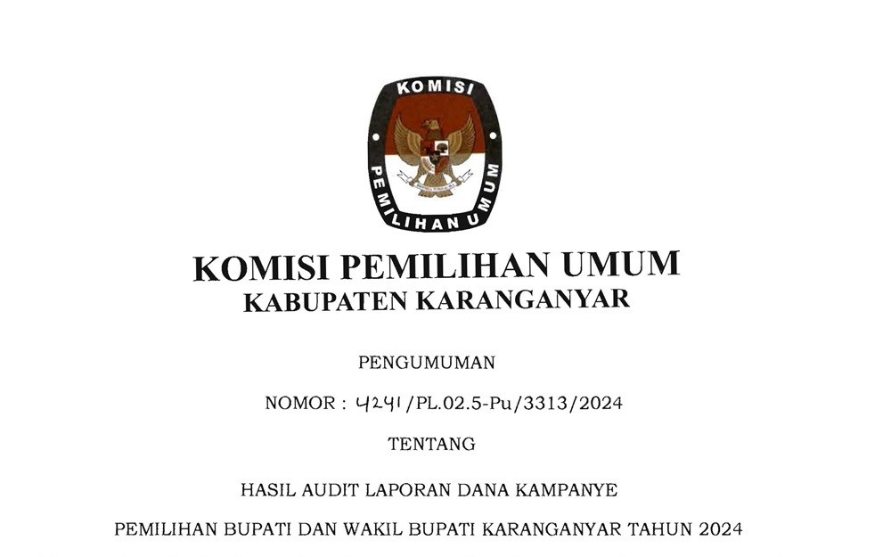 Pengumuman tentang Hasil Audit Laporan Dana Kampanye Pemilihan Bupati dan Wakil Bupati Karanganyar Tahun 2024 Kamis, 12 Desember 2024 13:00 738 DOWNLOAD PENGUMUMAN Baca Selengkapnya