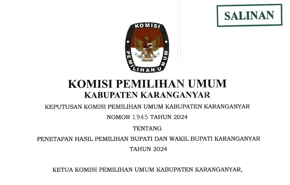 Keputusan KPU Karanganyar Nomor 1945 Tahun 2024 Tentang Penetapan Hasil Pemilihan Bupati dan Wakil Bupati Karanganyar Tahun 2024 Rabu, 04 Desember 2024 14:00 1 DOWNLOAD KEPUTUSAN Baca Selengkapnya
