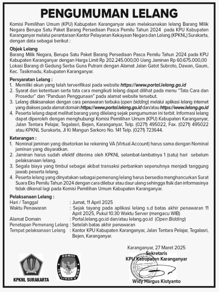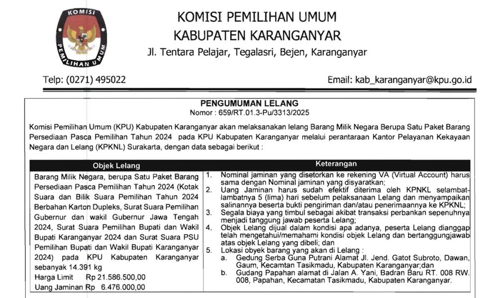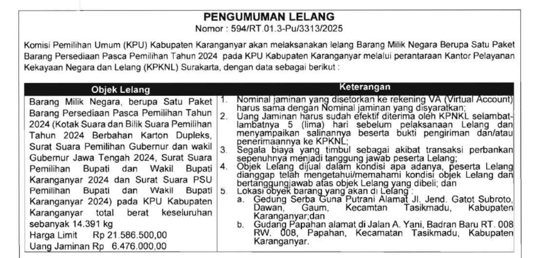 Pengumuman Lelang Barang Milik Negara (BMN) Persediaan Eks Logistik Pilkada 2024 Pada KPU Kabupaten Karanganyar Jumat, 15 Agustus 2025 09:28 106 Berikut pengumuman Lelang Barang Milik Negara (BMN) Persediaan Eks Logistik Pilkada 2024 Pada KPU Kabupaten Karanganyar. DOWNLOAD PENGUMUMAN Baca Selengkapnya