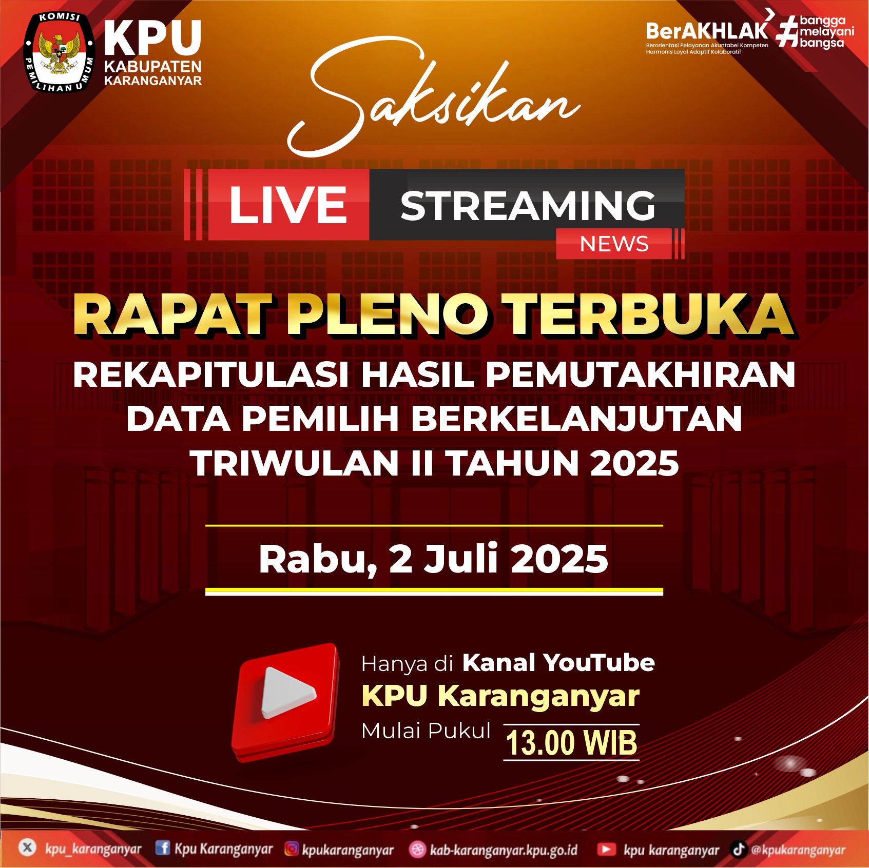 KPU Kabupaten Karanganyar mengucapkan Selamat Hari Bhayangkara ke-79. Terima kasih atas dedikasi Polri dalam menjaga keamanan dan ketertiban, termasuk dalam pengamanan penyelenggaraan Pemilu.