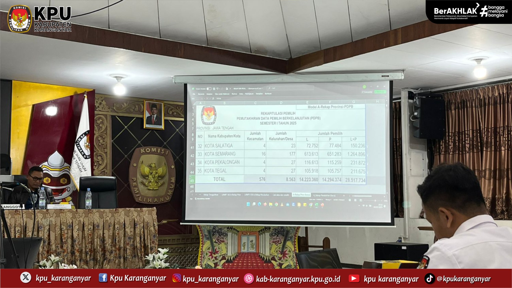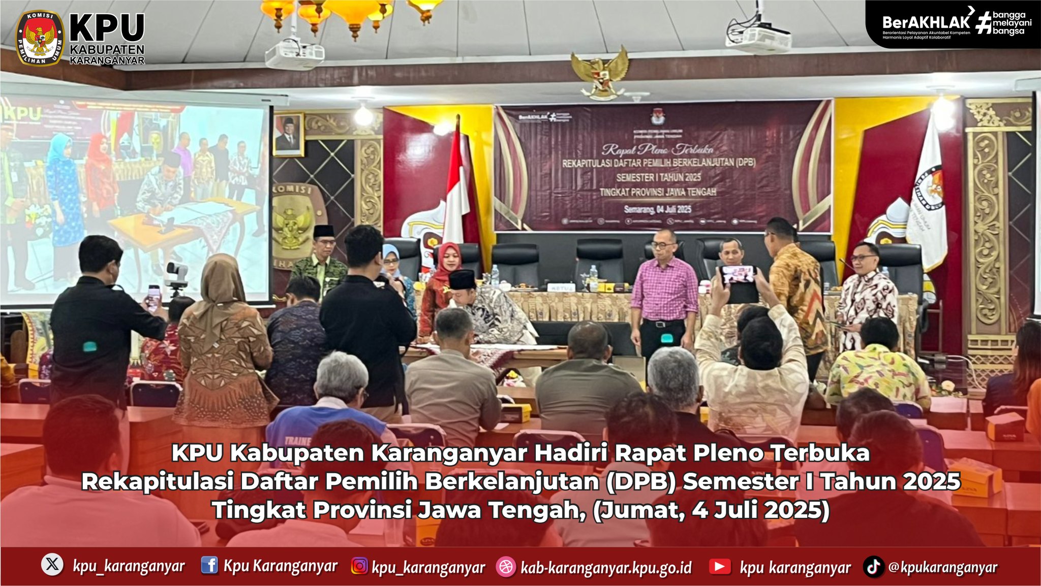 KPU Kabupaten Karanganyar menghadiri kegiatan Rapat Pleno Terbuka Rekapitulasi Daftar Pemilih Berkelanjutan (DPB) Semester I Tahun 2025 yang diselenggarakan oleh KPU Provinsi Jawa Tengah pada hari Jumat 04 Juli 2025.