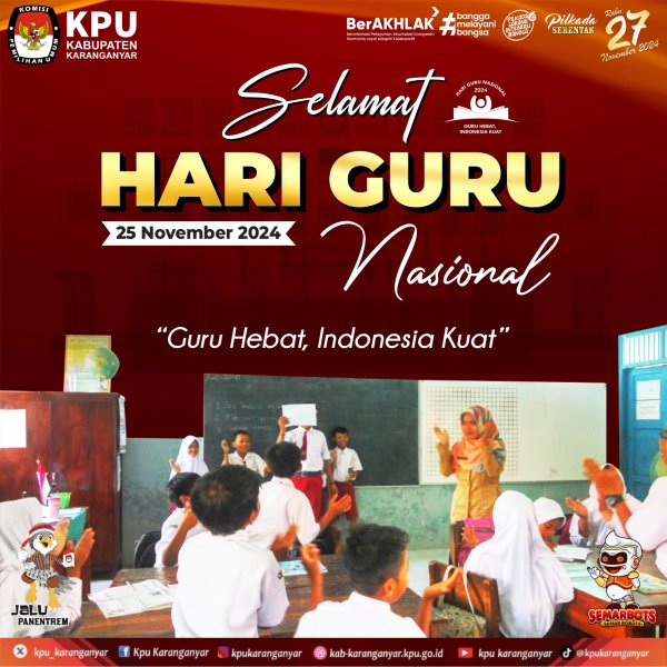 KPU Kabupaten Karanganyar mengucapkan . Guru adalah jembatan ilmu, pendorong mimpi, dan penggerak perubahan.
