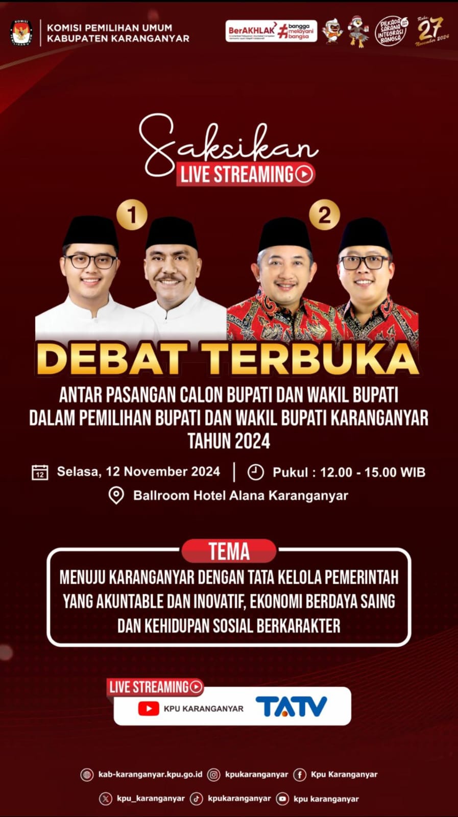 Di Hotel Alana Karanganyar, Selasa, 12 November 2024 mulai pukul 12.00 - 15.00 WIB. Dapat pula ditonton secara LIVE di Youtube KPU Karanganyar dan TATV