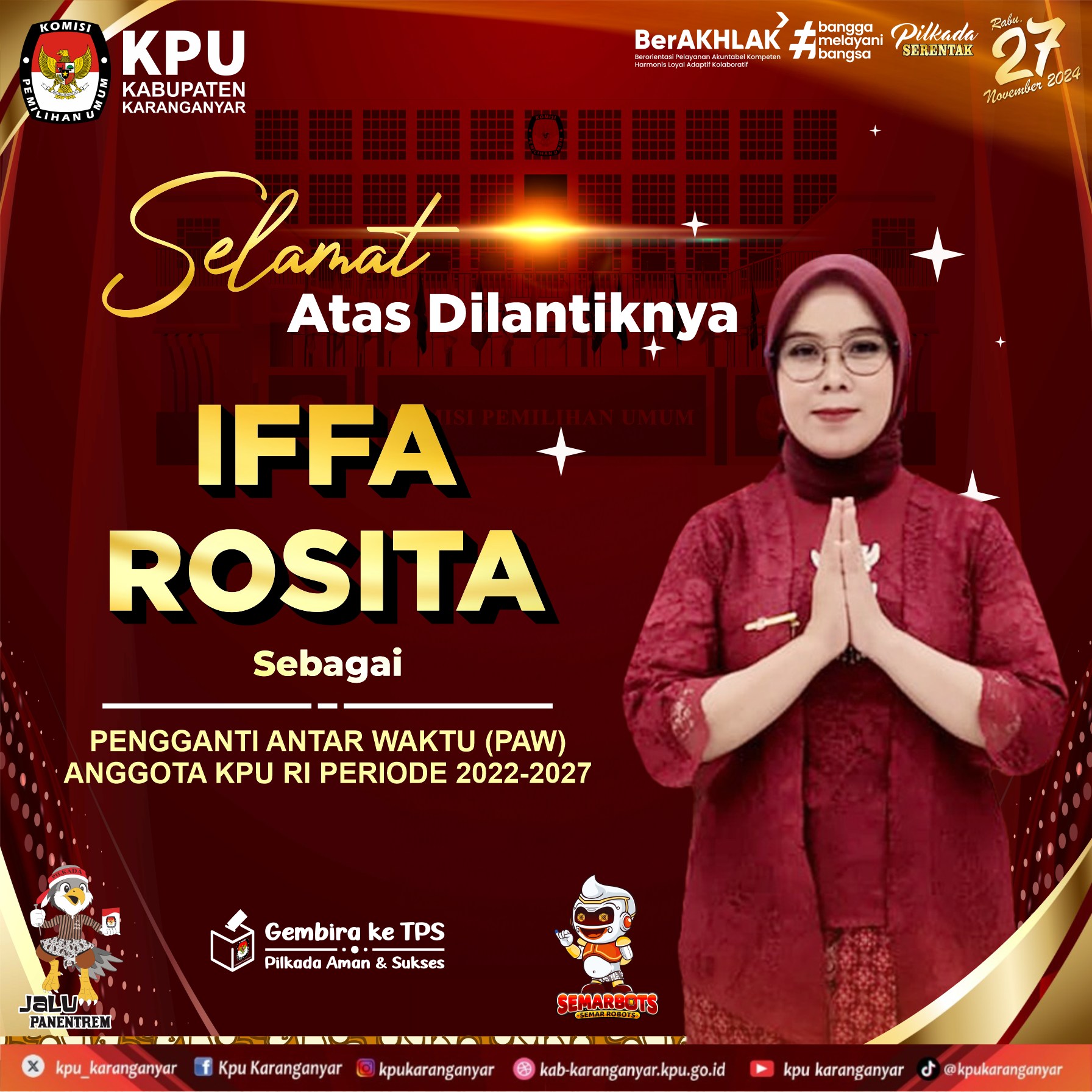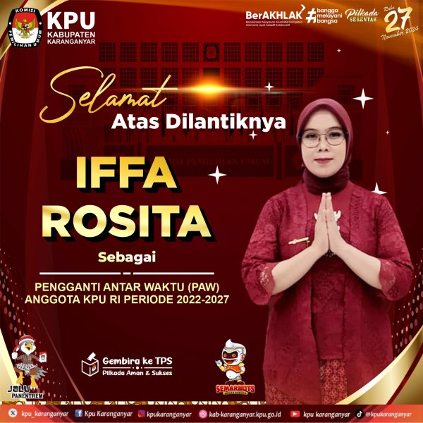 Selamat dan Sukses atas dilantiknya Iffa Rosita sebagai Pengganti Antar Waktu (PAW) Anggota KPU RI Periode 2022-2027. Selasa, 05 November 2024 11:01 6 KPU Kabupaten Karanganyar mengucapkan #KPUKaranganyar #Pilkada2024 Bagikan: Telah dilihat 6 kali