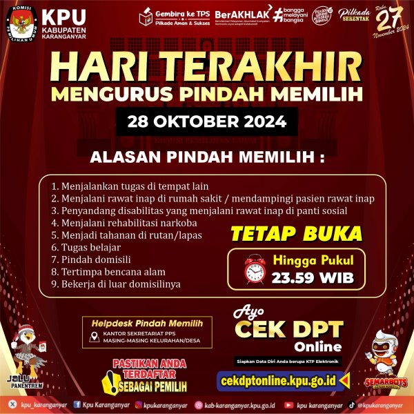 Hari ini 28 Oktober 2024, merupakanSegera datangi Kantor KPU Kabupaten/Kota, Sekretariat PPK/PPS terdekat dari daerah asal maupun daerah tujuan. Jangan sampai terlewat yaaa.