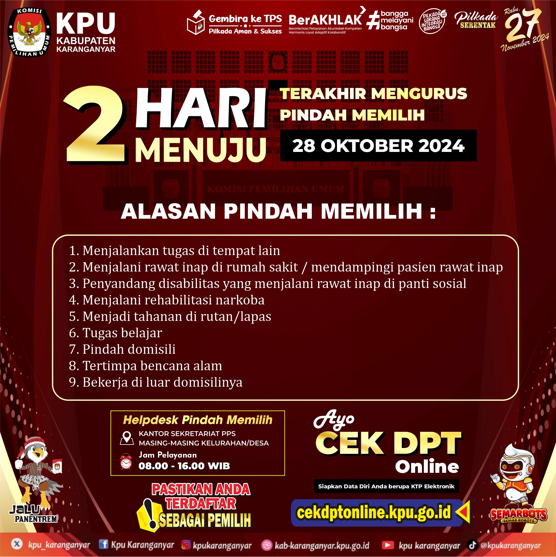 Hubungi PPS, PPK. atau datang langsung ke Kantor KPU Kabupaten Karanganyar untuk pelayanan pindah memilih.