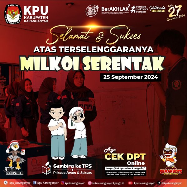 KPU Karanganyar mengucapkan selamat dan sukses atas terselenggaranya gelaran Pemilihan Ketua OSIS (Milkoi) Serentak 2024.