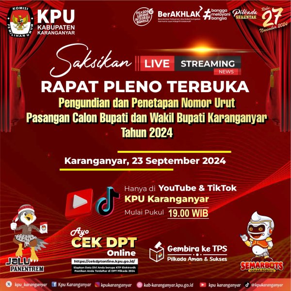 saksikan Live Streaming Pengundian Nomor Urut Pasangan Calon Bupati dan Wakil Bupati Karanganyar Tahun 2024 hanya di Youtube Channel dan Tiktok KPU Karanganyar.
