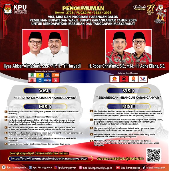 Berikut adalah visi, misi dan program pasangan calon Pemilihan Bupati dan Wakil Bupati Karanganyar Tahun 2024 untuk mendapatkan masukan dan tanggapan masyarakat.
