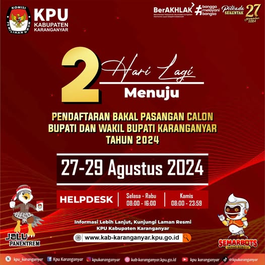 2 Hari lagi menuju Pendaftaran Bakal calon Bupati dan Wakil Bupati Karanganyar pada Pilkada 2024.