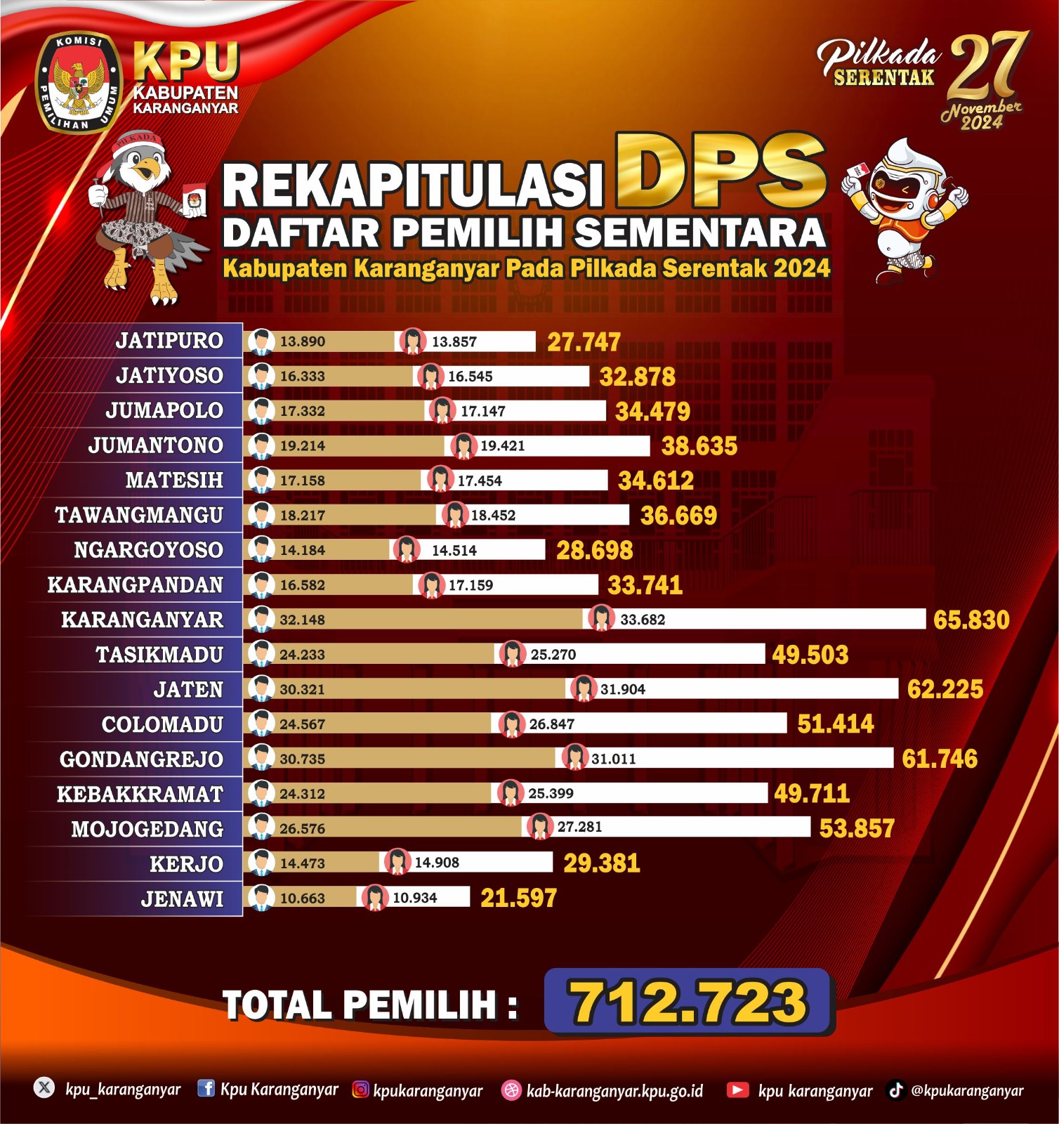 Infografis Rekapitulasi Daftar Pemilih Sementara (DPS) Kabupaten Karanganyar pada Pilkada Serentak Tahun 2024.