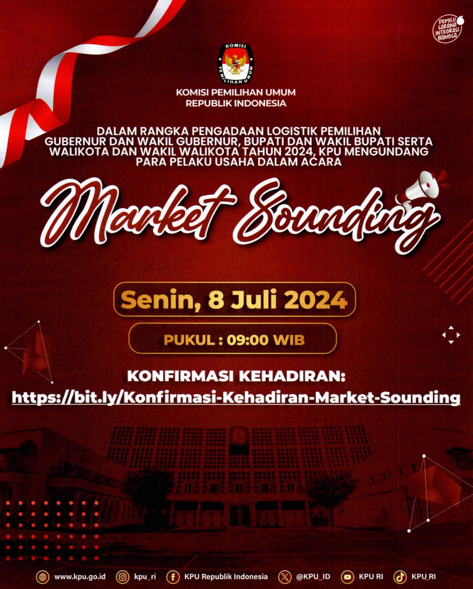 Berikut Pemberitahuan/Pengumuman dalam rangka Pelaksanaan Kegiatan Market Sounding dalam rangka Pengadaan Logistik Pemilihan 2024 pada Rapat Koordinasi dan Bimbingan Teknis Persiapan Pengadaan Logistik Pemilihan Gubernur dan Wakil Gubernur, Bupati dan Wakil Bupati, serta Walikota dan Wakil Walikota Tahun 2024.