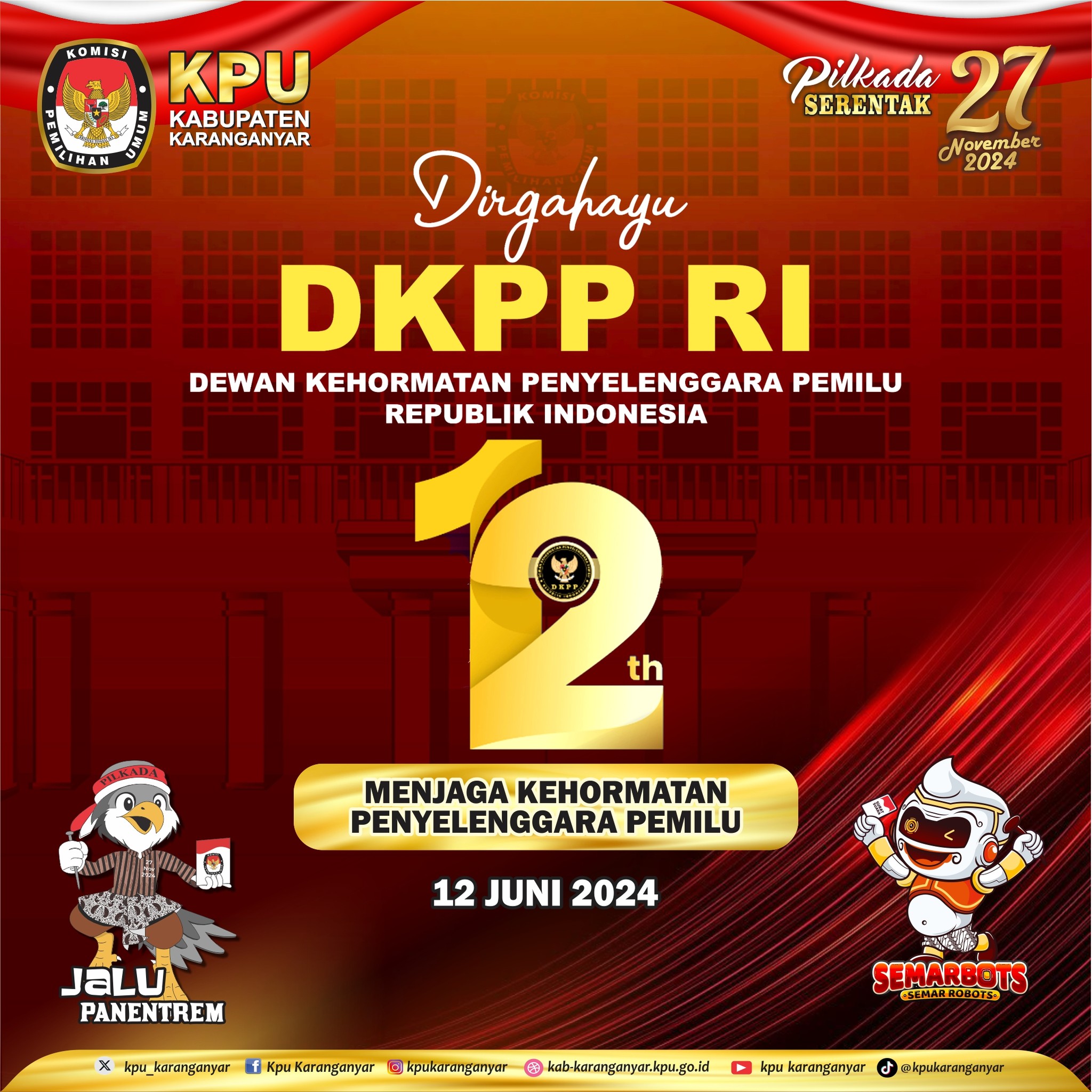 KPU Kabupaten Karanganyar mengucapkan Selamat Memperingati Dirgahayu DKPP RI (Dewan Kehormatan Penyelenggara Pemilu Republik Indonesia) 12 Juni 2024.