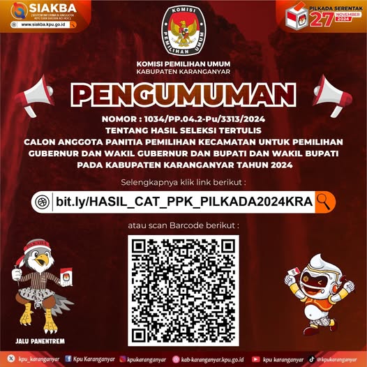 Pengumuman Hasil Seleksi Tertulis Calon Anggota Panitia Pemilihan Kecamatan (PPK) untuk Pilkada Serentak Tahun 2024 Kabupaten Karanganyar.