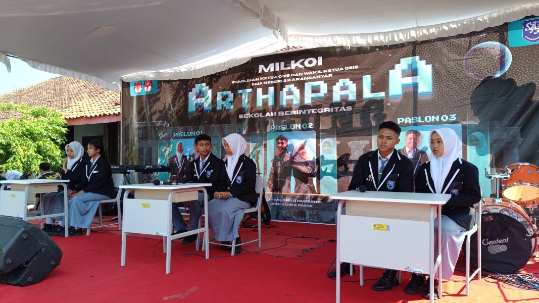 KARANGANYAR – Dalam rangka menyukseskan program Milkoi (Pemilihan Ketua OSIS) Tahun 2025, SMAN 2 Karanganyar menggelar Debat Kandidat Pasangan Calon Ketua dan Wakil Ketua OSIS serta pemungutan dan penghitungan suara (Tungsura). Kegiatan tersebut digelar serentak dalam satu hari bertempat di halaman SMAN 2 Karanganyar, Kamis, (25/09/2025). Dalam kegiatan tersebut Ketua Divisi Sosdiklih, Parmas, dan SDM KPU Karanganyar, Andis Yuli Pamungkas hadir secara langsung memberikan dukungan serta membuka acara.