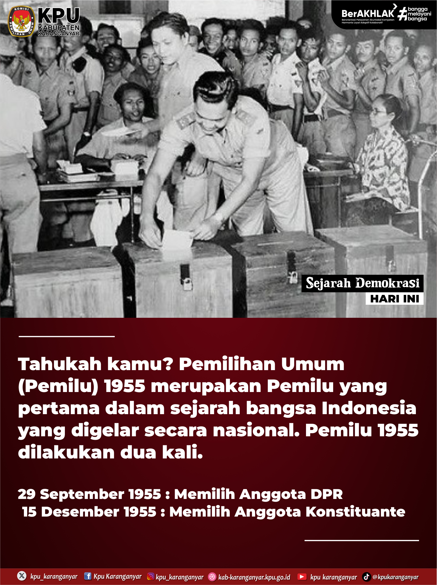 Tahukah kamu? Pemilihan Umum (Pemilu) 1955 merupakan Pemilu yang pertama dalam sejarah bangsa Indonesia yang digelar secara nasional. Pemilu 1955 dilakukan dua kali.
