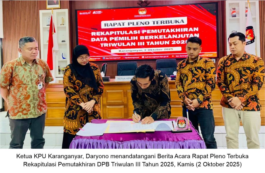 Pada Kamis, 2 Oktober 2025 lalu, KPU Kabupaten Karanganyar menetapkan rekapitulasi pemutakhiran Daftar Pemilih Berkelanjutan (DPB) Triwulan III Tahun 2025. Jumlah pemilih DPB di Kabupaten Karanganyar ditetapkan sebanyak 725.663 pemilih. Terdiri dari 356.823 pemilih laki-laki dan 386.840 pemilih perempuan.