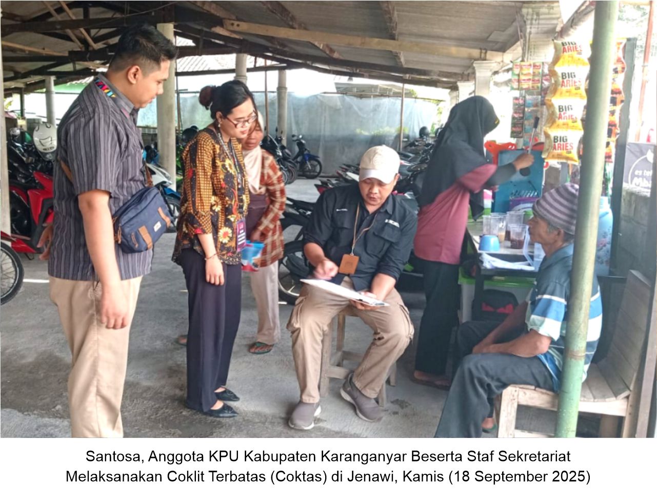 KPU Karanganyar melakukan coktas pada tanggal 16-19 September 2025. Jumlah data yang perlu dilakukan validasi sebanyak 290 data pemilih, tersebar di 17 kecamatan.