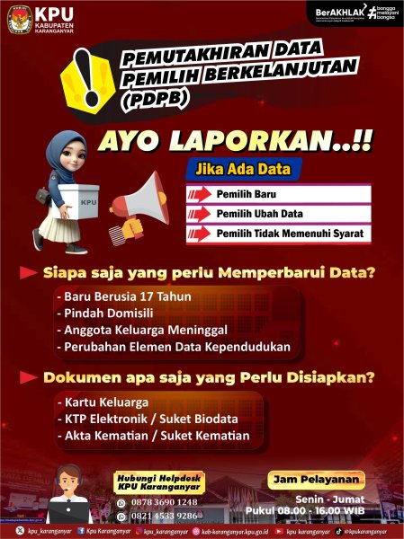 #TemanPemilih, KPU Karanganyar membuka layanan masukan dan tanggapan masyarakat terhadap Pemutakhiran Data Pemilih Berkelanjutan (PDPB) di Kabupaten Karanganyar, dimana kegiatan ini bertujuan untuk memperbarui data pemilih.