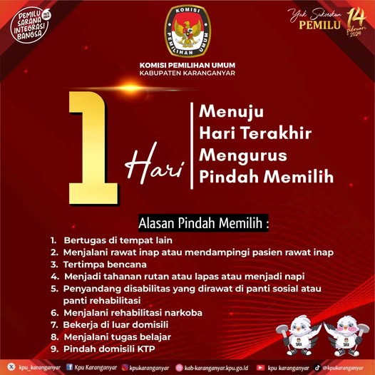 1 Hari Menuju Hari Terakhir Mengurus Pindah Memilih. Minggu, 14 Januari 2024 10:47 3 #KPUMelayani #PemiluSerentak2024 Bagikan: Telah dilihat 3 kali