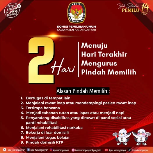 2 Hari Menuju Hari Terakhir Mengurus Pindah Memilih. Sabtu, 13 Januari 2024 10:48 3 #KPUMelayani #PemiluSerentak2024 Bagikan: Telah dilihat 3 kali