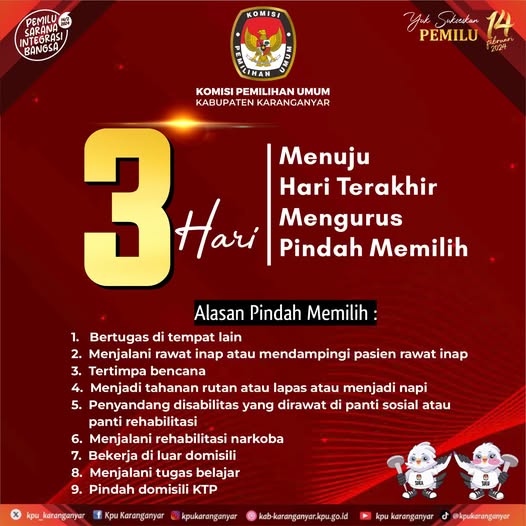 3 Hari Menuju Hari Terakhir Mengurus Pindah Memilih. Jumat, 12 Januari 2024 10:54 3 #KPUMelayani #PemiluSerentak2024 Bagikan: Telah dilihat 3 kali