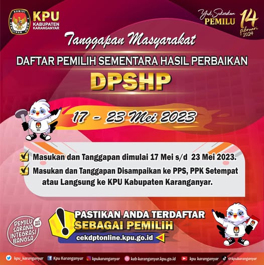 Pengumuman Tanggapan Masyarakat DPSHP (17-23 Mei 2023) Rabu, 17 Mei 2023 08:46 3 #KPUMelayani #PemiluSerentak2024 Bagikan: Telah dilihat 3 kali