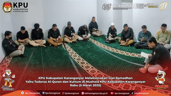 KPU Kabupaten Karanganyar Melaksanakan Giat Ramadhan Yaitu Tadarus Al-Quran dan Kultum di Mushola KPU Kabupaten Karanganyar, Rabu (5 Maret 2025). Rabu, 05 Maret 2025 09:51 4 #kpukaranganyar #ramadan2025 Bagikan: Telah dilihat 4 kali