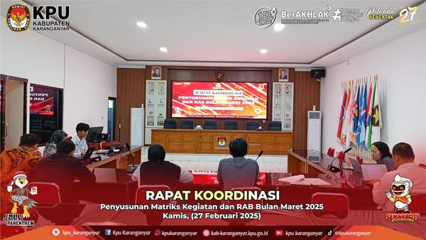 Rapat Koordinasi Penyusunan Matriks Kegiatan dan RAB Bulan Maret 2025, Kamis, (27 Februari 2025). Kamis, 27 Februari 2025 10:21 1 KPU Kabupaten Karanganyar Melaksanakan Kegiatan #KPUKaranganyar Bagikan: Telah dilihat 1 kali
