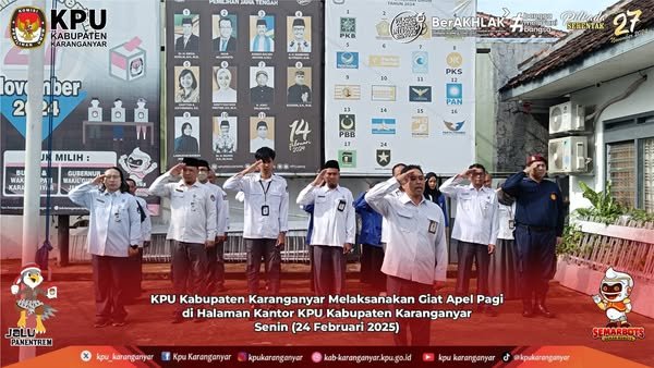 Giat Apel Pagi di Halaman Kantor KPU Kabupaten Karanganyar dengan dipimpin oleh Anggota KPU Kabupaten Karanganyar, Santoso, Senin (24 Februari 2025). Kamis, 27 Februari 2025 10:33 1 KPU Kabupaten Karanganyar Melaksanakan #KPUKaranganyar Bagikan: Telah dilihat 1 kali