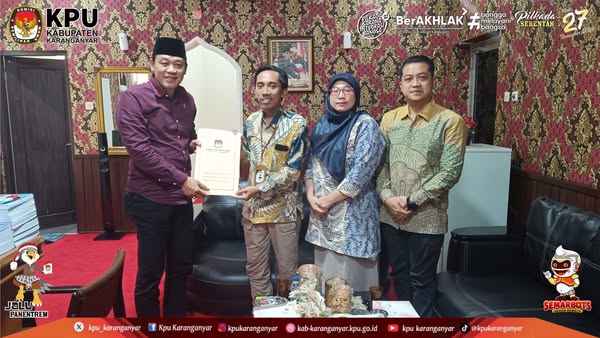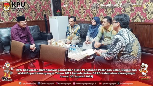 KPU Kabupaten Karanganyar Sampaikan Hasil Penetapan Pasangan Calon Bupati dan Wakil Bupati Karanganyar Tahun 2024 kepada Ketua DPRD Kabupaten Karanganyar, Jumat (10 Januari 2025). Senin, 13 Januari 2025 11:23 2 #KPUKaranganyar Bagikan: Telah dilihat 2 kali