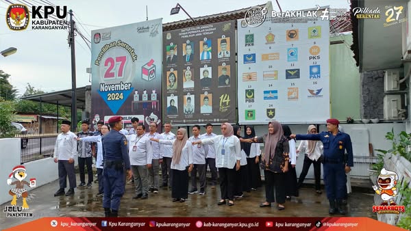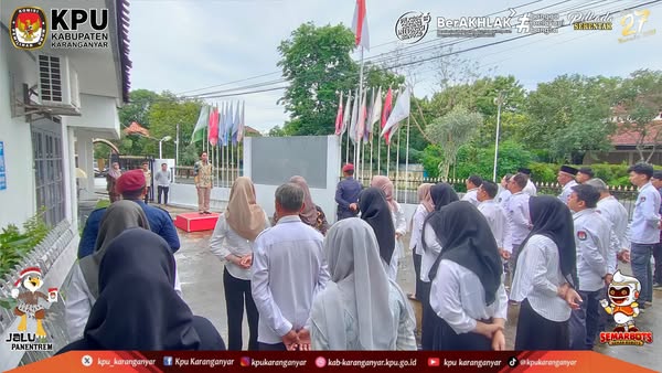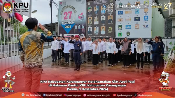 Giat Apel Pagi di Halaman Kantor KPU Kabupaten Karanganyar dengan dipimpin oleh Ketua KPU Kabupaten Karanganyar, Daryono (Senin, 9 Desember 2024).