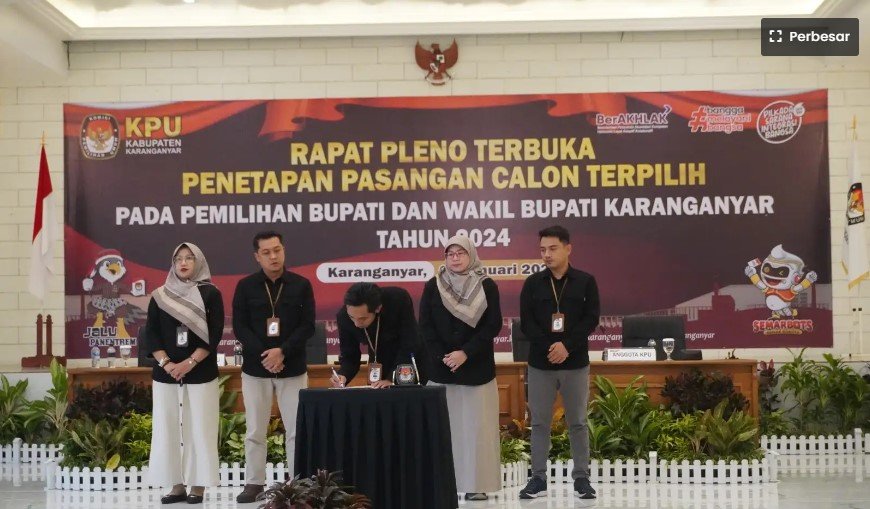 Komisi Pemilihan Umum (KPU) Karanganyar secara resmi menetapkan Rober Christanto dan Adhe Eliana sebagai calon bupati dan wakil bupati (wabup) terpilih berdasarkan hasil pemungutan dan penghitungan suara Pilkada serentak 2024.