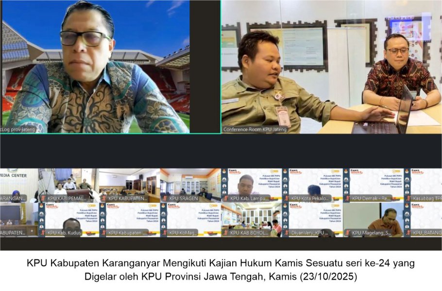KARANGANYAR - Komisi Pemilihan Umum (KPU) Kabupaten Karanganyar terus memperkuat pemahaman hukum kepemiluan dengan mengikuti Kajian Hukum Kamis Sesuatu seri ke-24 yang digelar oleh KPU Provinsi Jawa Tengah, Kamis (23/10/2025). Dalam forum ini, KPU Karanganyar mendalami putusan Mahkamah Konstitusi (MK) terkait sengketa Pemilihan Bupati dan Wakil Bupati Pesawaran, Provinsi Lampung Tahun 2024. Kegiatan ini diikuti Divisi Hukum dan Pengawasan KPU Karanganyar bersama staf Subbagian TPPH, serta turut dihadiri KPU Provinsi Lampung dan KPU Kabupaten/Kota se-Jawa Tengah.