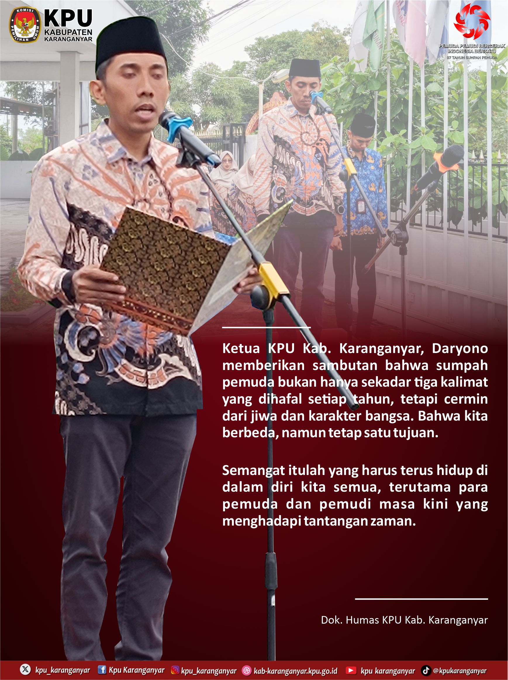 Ketua KPU Kab. Karanganyar, Daryono memberikan sambutan bahwa sumpah pemuda bukan hanya sekadar tiga kalimat yang dihafal setiap tahun, tetapi cermin dari jiwa dan karakter bangsa. Bahwa kita berbeda, namun tetap satu tujuan.