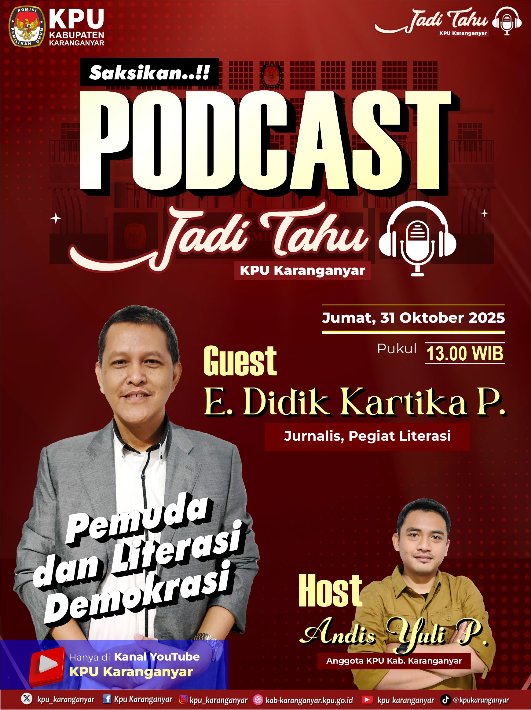 Podcast edisi kali ini akan membahas tema "Pemuda dan Literasi Demokrasi". Catat tanggalnya guys, stay tune di kanal Youtube KPU Karanganyar, Jumat, 31 Oktober 2025, pukul 13.00 WIB.