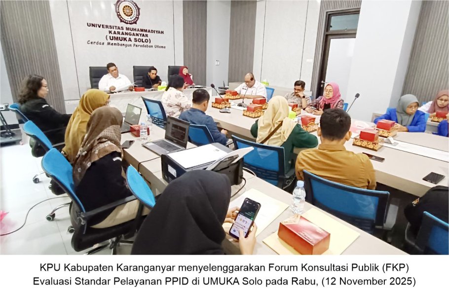 Karanganyar – KPU Kabupaten Karanganyar sukses menyelenggarakan Forum Konsultasi Publik (FKP) Evaluasi Standar Pelayanan Pejabat Pengelola Informasi dan Dokumentasi (PPID) pada Rabu (12/11) di Ruang Rapat Universitas Muhammadiyah Karanganyar (UMUKA). Kegiatan ini menjadi wadah partisipatif untuk menjaring saran dan kritik konstruktif dari berbagai pemangku kepentingan dalam rangka penyempurnaan Standar Pelayanan PPID.