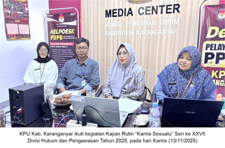 Komisi Pemilihan Umum (KPU) Kabupaten Karanganyar ikuti kegiatan Kajian Rutin “Kamis Sesuatu” Seri ke XXVII Divisi Hukum dan Pengawasan Tahun 2025, di Kantor KPU Kabupaten Karanganyar, Kamis (13/11/2025) secara daring yang diselenggarakan oleh KPU Provinsi Jawa Tengah.
