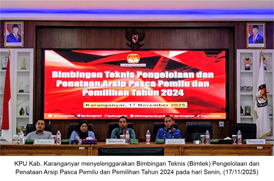 KARANGANYAR — Komisi Pemilihan Umum (KPU) Kabupaten Karanganyar menyelenggarakan Bimbingan Teknis (Bimtek) Pengelolaan dan Penataan Arsip Pasca Pemilu dan Pemilihan Tahun 2024 pada Senin (17/11/2025). Bertempat di Aula KPU Karanganyar, Jalan Tentara Pelajar Tegalasri, Bejen, Karanganyar ini diikuti seluruh jajaran komisioner dan pegawai. Bimtek menghadirkan narasumber Arsiparis dari Dinas Kearsipan dan Perpustakaan (Disarpus) Kabupaten Karanganyar.