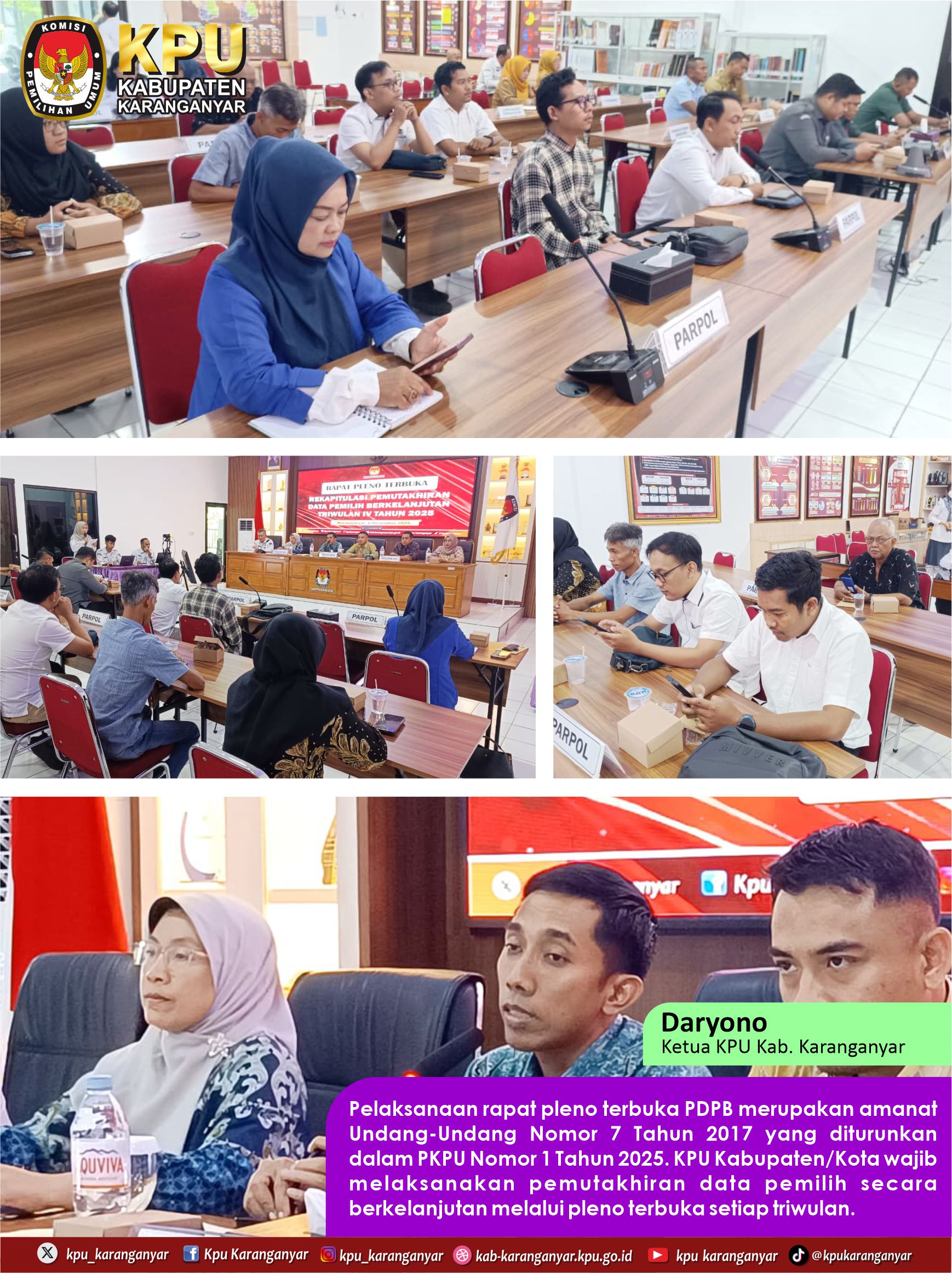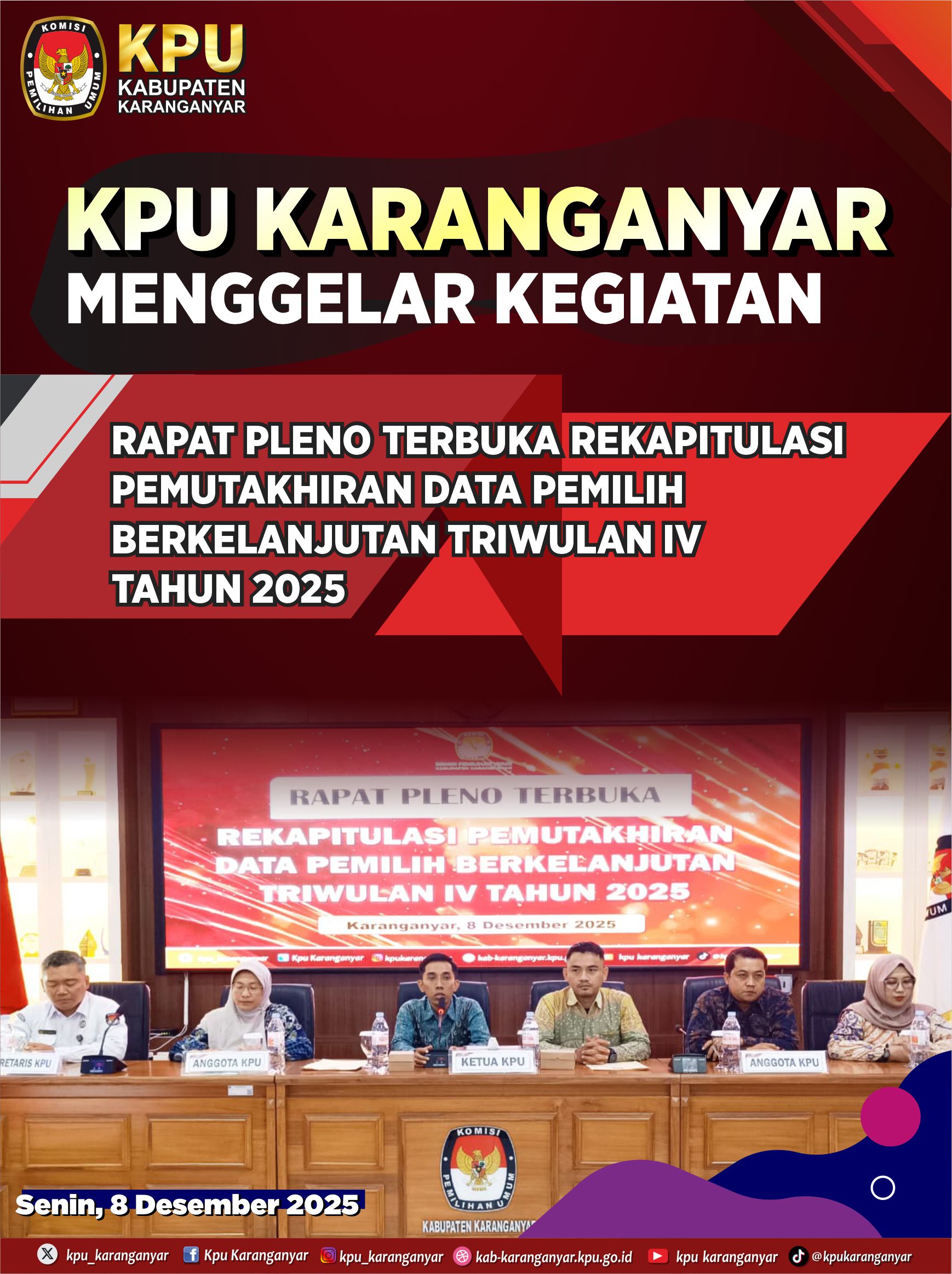 #Temanpemilih, KPU Karanganyar menggelar Rapat Pleno Terbuka Rekapitulasi Pemutakhiran Data Pemilih Berkelanjutan (PDPB) Triwulan IV Tahun 2025, Senin (08/12/2025), di Aula Kantor KPU Kabupaten Karanganyar.