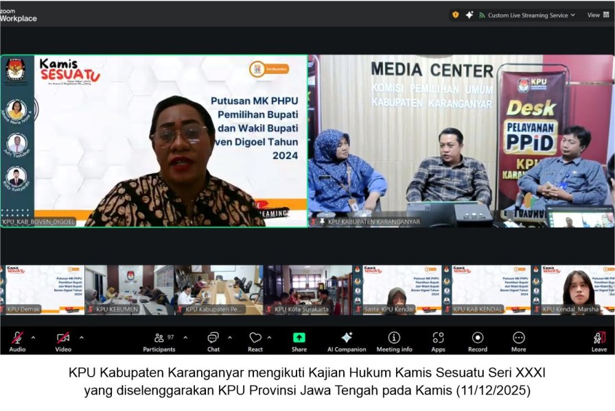 KPU Kabupaten Karanganyar, melalui Tim JDIH, mengikuti Kajian Hukum Kamis Sesuatu Seri XXXI yang diselenggarakan KPU Provinsi Jawa Tengah pada Kamis (11/12/2025). Kegiatan yang berlangsung secara daring ini membahas Putusan Mahkamah Konstitusi Nomor 260/PHPU.BUP-XXIII/2025 terkait sengketa hasil Pemilihan Bupati dan Wakil Bupati Boven Digoel Tahun 2024, dengan sorotan utama pada pentingnya kejujuran calon dan ketelitian verifikasi dokumen pencalonan.