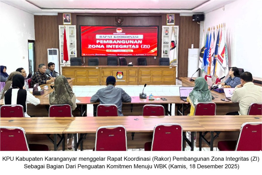 KARANGANYAR – Komisi Pemilihan Umum (KPU) Kabupaten Karanganyar menggelar Rapat Koordinasi (Rakor) Pembangunan Zona Integritas (ZI) yang difokuskan pada pencermatan final pengisian Lembar Kerja Evaluasi (LKE) ZI serta pengamatan secara lebih detail terhadap kelengkapan data dukung dan eviden, sebagai bagian dari penguatan komitmen menuju Wilayah Bebas dari Korupsi (WBK). Kegiatan tersebut dilaksanakan pada Kamis, 18 Desember 2025, bertempat di Aula Kantor KPU Kabupaten Karanganyar, dan diikuti oleh Satuan Tugas (Satgas) Zona Integritas KPU Kabupaten Karanganyar.