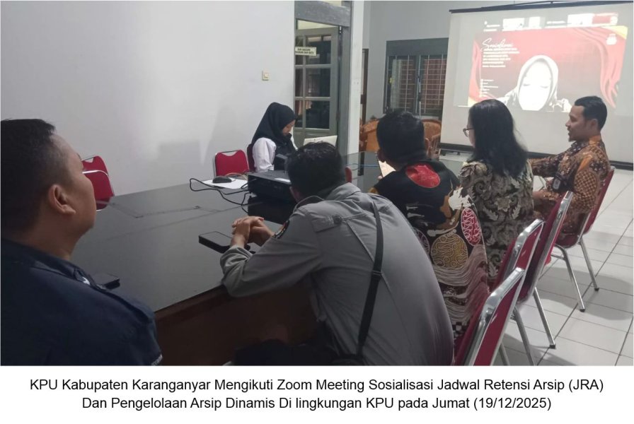 KARANGANYAR – Dalam upaya meningkatkan pemahaman dan kapasitas pengelola arsip dalam menerapkan pengelolaan arsip dinamis yang tertib, sistematis, dan sesuai dengan ketentuan peraturan perundang-undangan, Komisi Pemilihan Umum (KPU) Kabupaten Karanganyar mengikuti Zoom Meeting Sosialisasi Jadwal Retensi Arsip (JRA) dan Pengelolaan Arsip Dinamis di lingkungan KPU pada hari Jumat, 19 Desember 2025. Kegiatan yang diikuti oleh Kepala Sub Bagian Keuangan Umum dan Logistik, Staf Keuangan Umum dan Logistik, serta Staf yang membidangi menghadirkan dua orang narasumber.