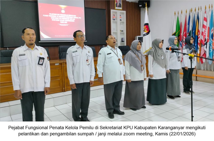 KARANGANYAR – Sekretaris Jenderal Komisi Pemilihan Umum (KPU) Republik Indonesia melantik dan mengambil sumpah/janji Pejabat Fungsional Penata Kelola Pemilihan Umum di lingkungan Sekretariat Jenderal KPU, Sekretariat KPU Provinsi/KIP Aceh dan Sekretariat KPU/KIP Kabupaten/Kota Tahun 2026. Acara Pelantikan dan Pengambilan Sumpah tersebut dipimpin langsung oleh Sekretaris Jenderal Komisi Pemilihan Umum Republik Indonesia (Sekjen KPU RI) Bernad Dermawan Sutrisno, Kamis (22/01/2026).