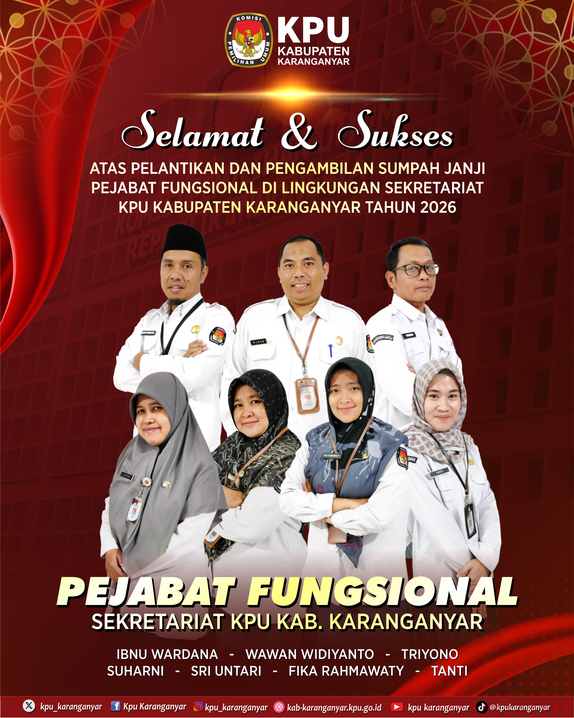 #Temanpemilih, KPU Karanganyar mengucapkan selamat dan sukses atas pelantikan dan pengambilan sumpah janji pejabat fungsional di lingkungan sekretariat KPU Karanganyar Tahun 2026.