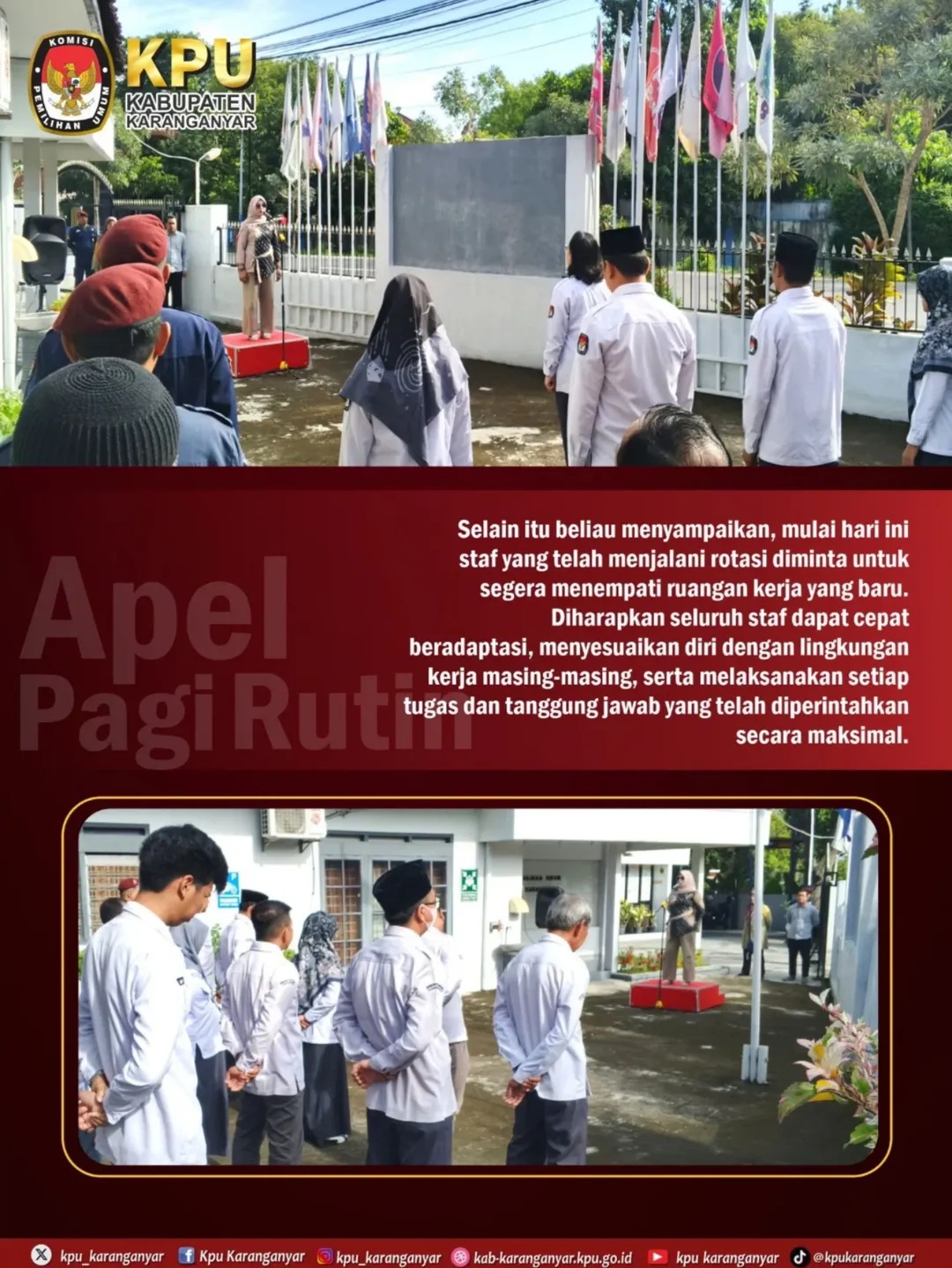 #Temanpemilih, KPU Kabupaten Karanganyar melaksanakan Apel Pagi Rutin pada Senin, 02 Februari 2026, bertempat di halaman Kantor KPU Kabupaten Karanganyar.