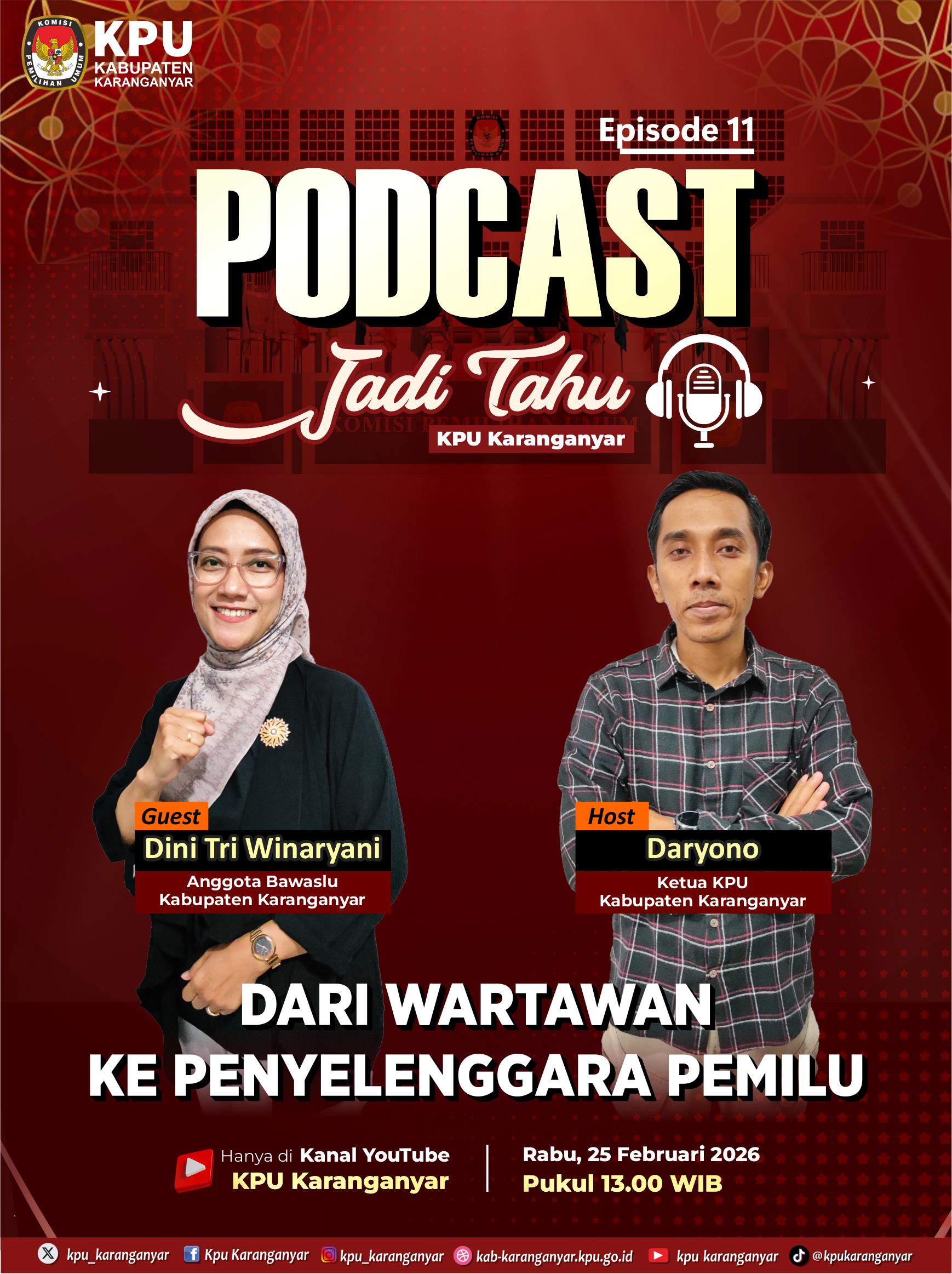Podcast edisi kali ini akan membahas tema "Dari Wartawan ke Penyelenggara Pemilu". Catat tanggalnya guys, stay tune di kanal Youtube KPU Karanganyar, Rabu, 25 Februari 2026, pukul 13.00 WIB.