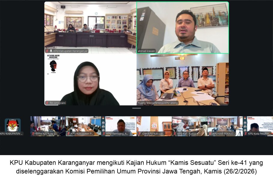 KARANGANYAR – Komisi Pemilihan Umum Kabupaten Karanganyar mengikuti Kajian Hukum “Kamis Sesuatu” Seri ke-41 yang diselenggarakan Komisi Pemilihan Umum Provinsi Jawa Tengah, Kamis (26/2/2026). Kegiatan ini diikuti Anggota KPU Karanganyar bersama jajaran Subbagian Teknis dan Hukum sebagai upaya penguatan kapasitas penyelenggara pemilu.